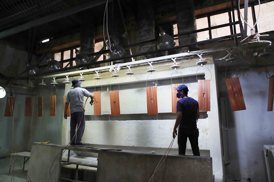 Giai đoạn 5: Đầu vào là phôi , trải qua quá trình tạo dáng, chà nhám, sơn, lắp ráp và sơn đóng gói, tạo thành thành phẩm hoàn chỉnh.